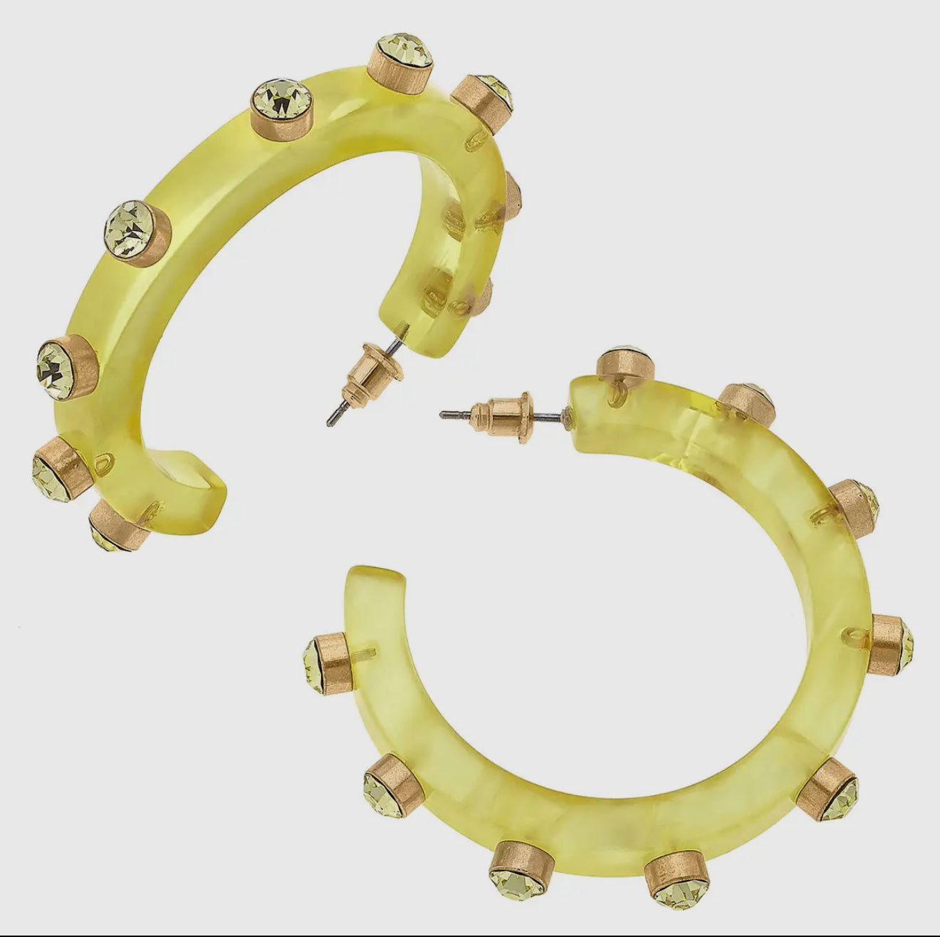 Introducing our Color Hoop Earrings in Yellow. These stunning earrings feature dazzling rhinestones and vibrant resin, making them the perfect statement piece to elevate any outfit. With a secure post-style closure and a 1.75" diameter, these hoops are both fashionable and functional. Add a touch of color and luxury to your collection now.